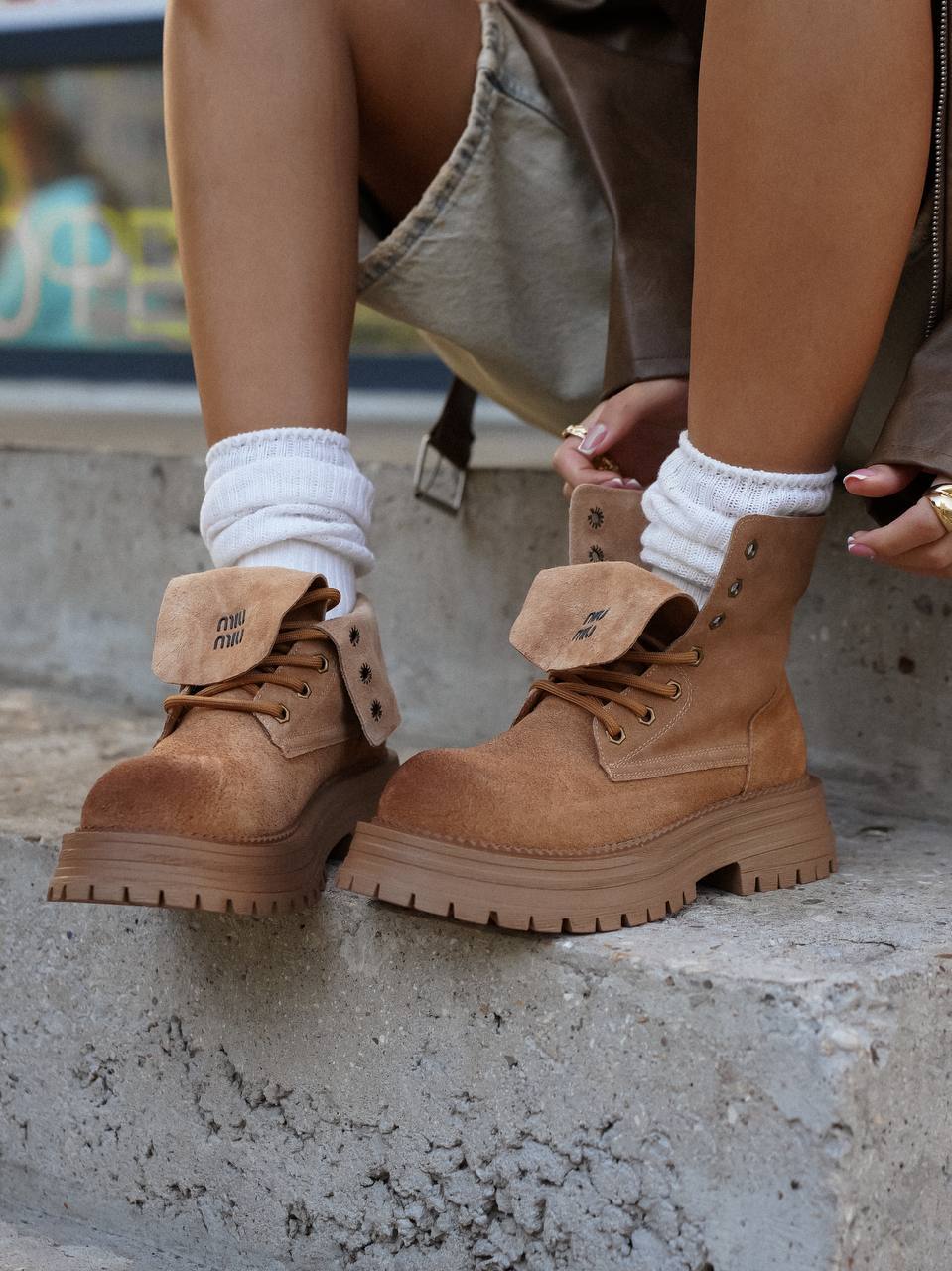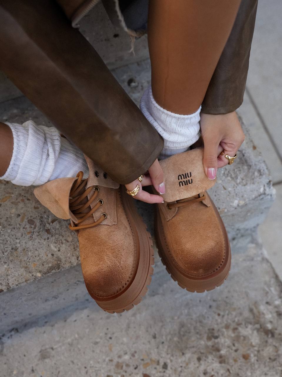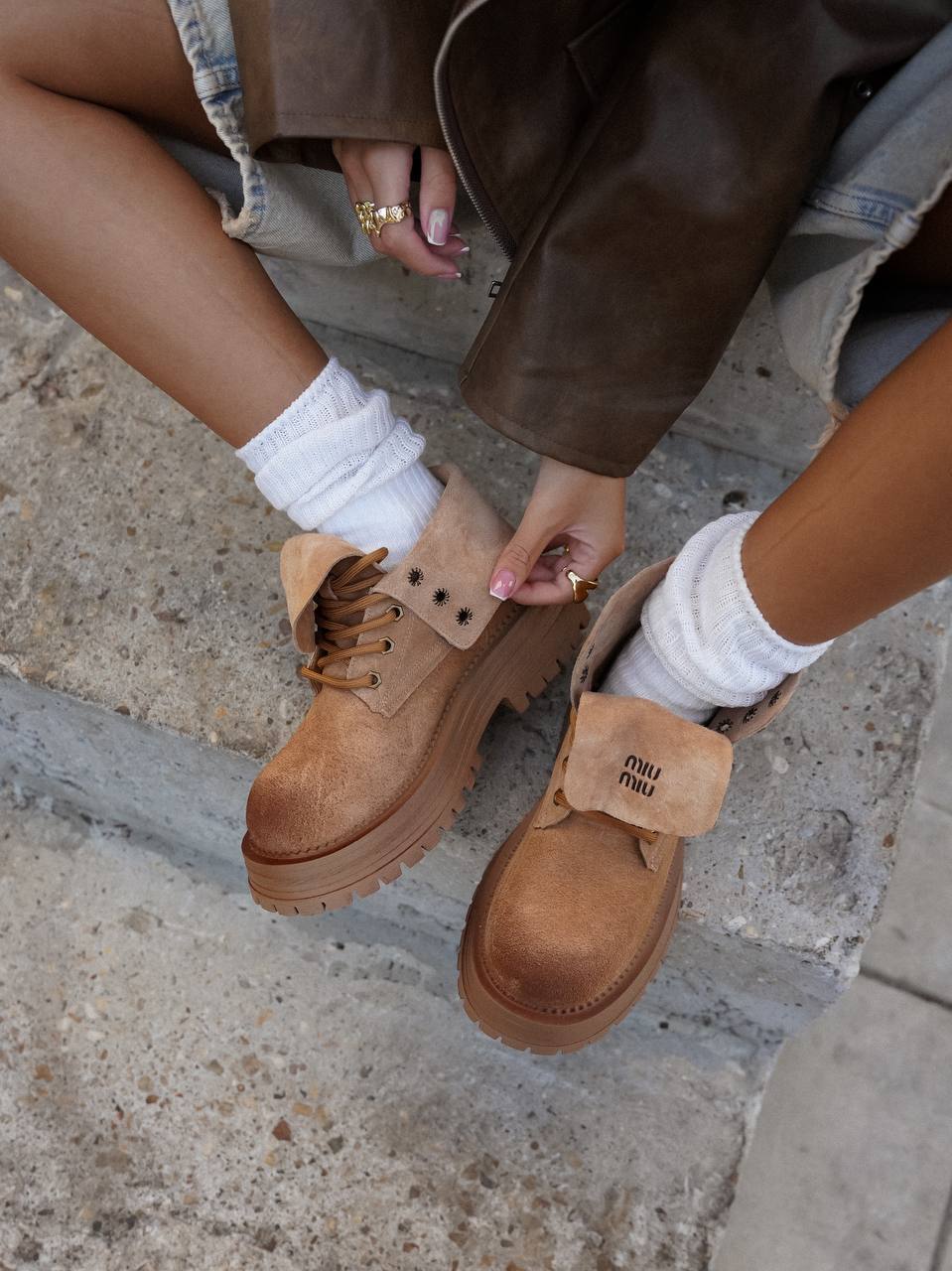 Силуэт коричневых ботинок позаимствовали у мунбутов. Модель с объемной шнуровкой изготовили из мягкой пластичной замши с бархатистой фактурой. Внутренняя отделка обеспечивает комфортный микроклимат. Широкая подошва дополнительно защищает от холода и слякоти.