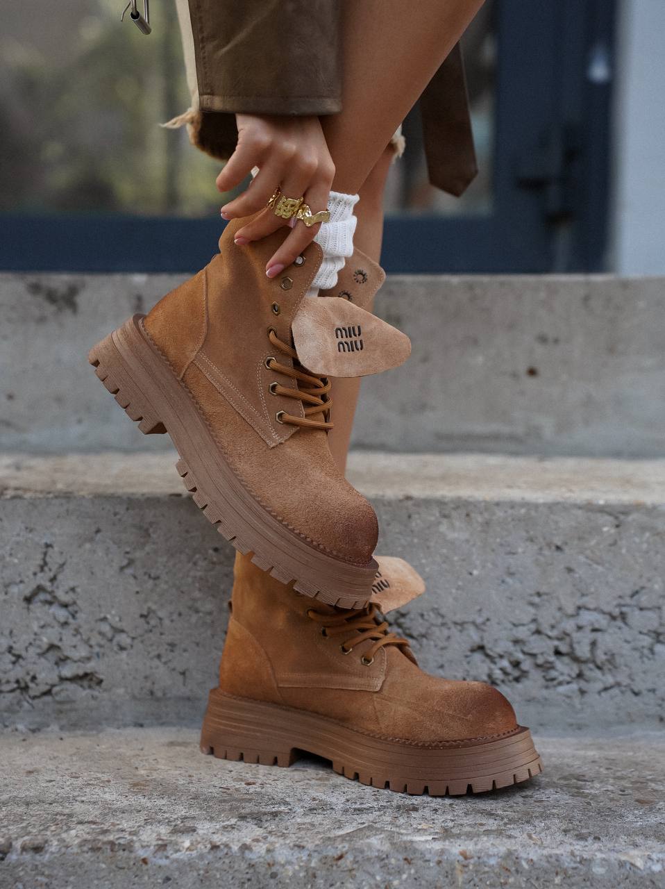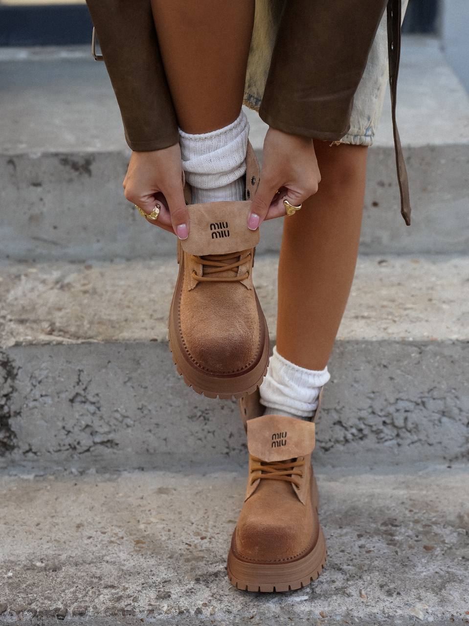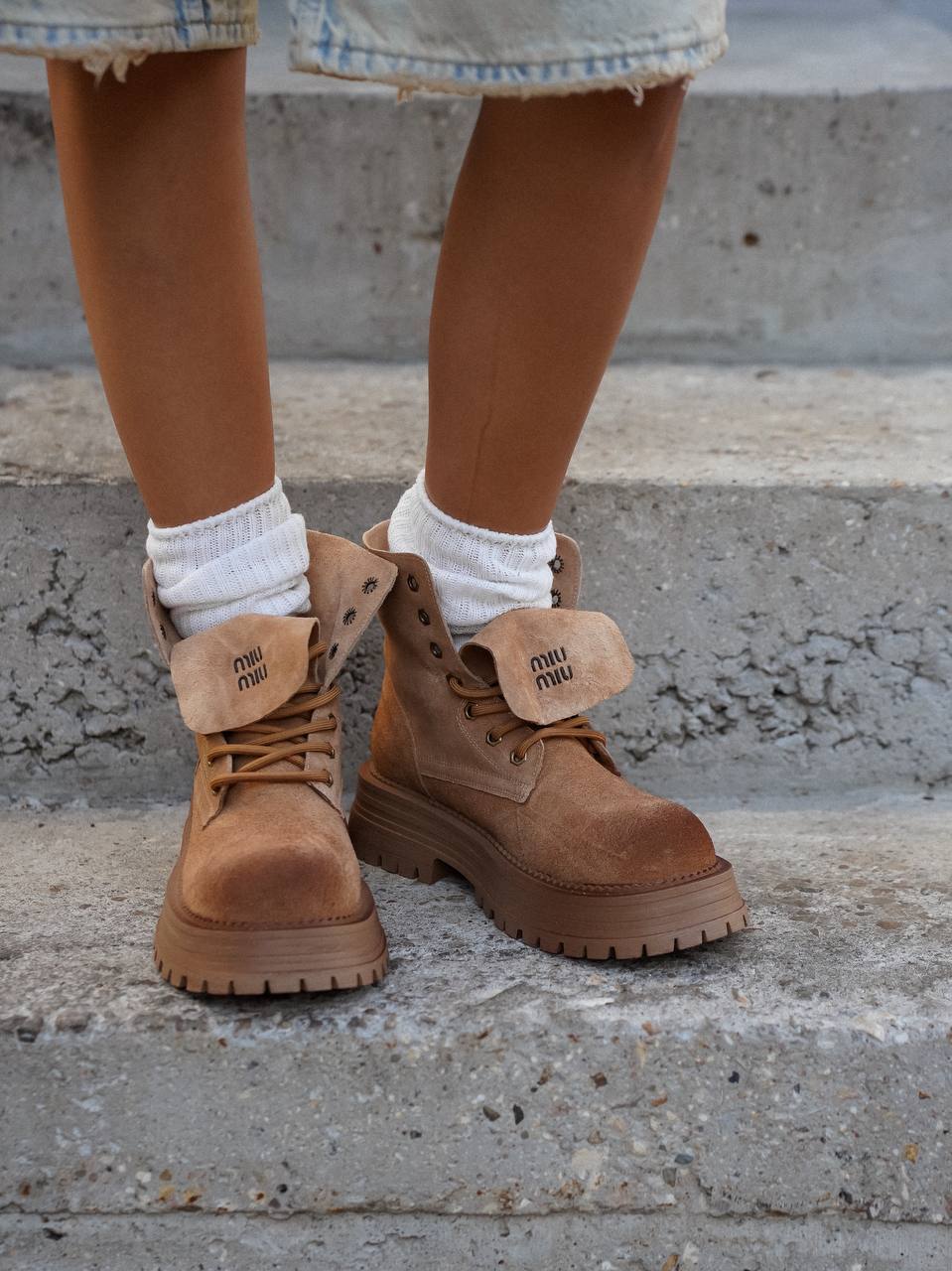 Силуэт коричневых ботинок позаимствовали у мунбутов. Модель с объемной шнуровкой изготовили из мягкой пластичной замши с бархатистой фактурой. Внутренняя отделка обеспечивает комфортный микроклимат. Широкая подошва дополнительно защищает от холода и слякоти.