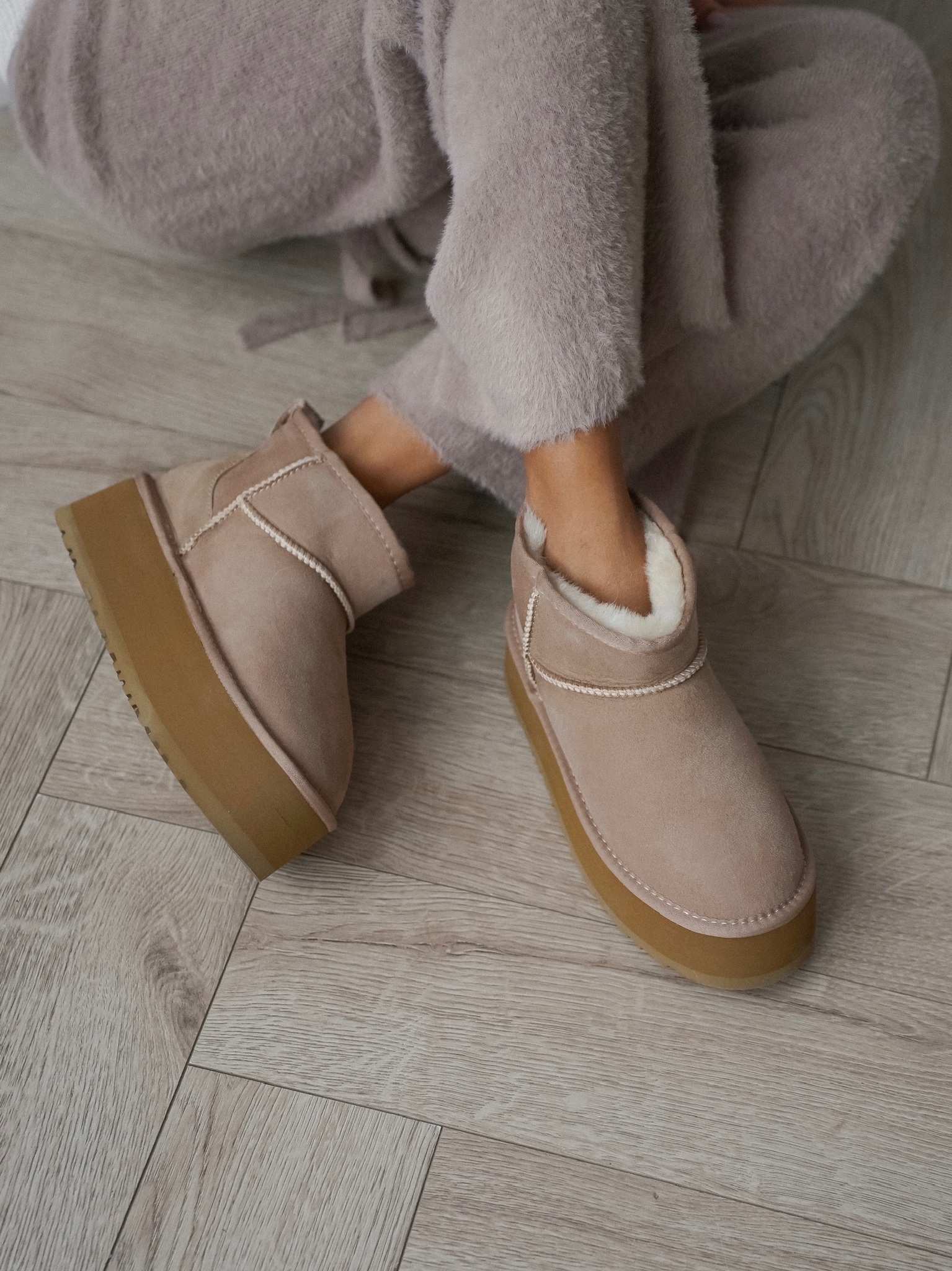 Угги на платформе Classic Mini Platform, современная интерпретация классики, достигает новых высот благодаря удлиняющей ноги 5-ти сантиметровой платформе. Предлагая более смелый вид, чем когда-либо прежде, произведенs из натуральной замши, а смесь меха и шерсти UGGplush™ обеспечивает фирменную мягкость.